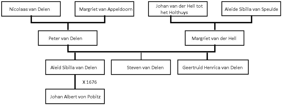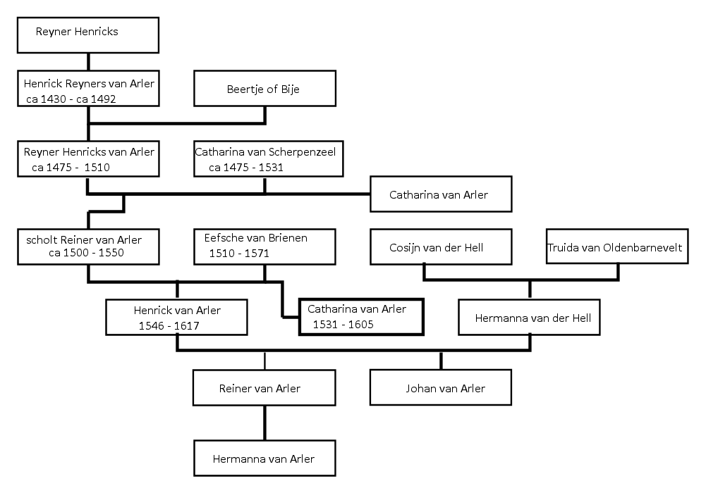 Periode Van der Hell en Van DelenWe kunnen nu proberen te begrijpen hoe de overgang van de Van Arlers naar de familie Van der Hell verliep. Documenten daarvan lijken er niet meer te zijn, dus we moeten ernaar gissen. De laatste bewoner van de Van Arlers was Hermanna van Arler. Haar grootmoeder was Hermanna van der Hell. Eerder in 1596 kwamen we Henrick van Arler in een proces tegen Alydt Pannekoeck, weduwe van Johan van der Hell. Idem in een proces uit 1554 Johan Pannekoek als momber van zijn vrouw (Catharina van Arler). Het was dus via de Pannekoeken allemaal familie van elkaar en die zullen sowieso in dezelfde kringen hebben verkeerd