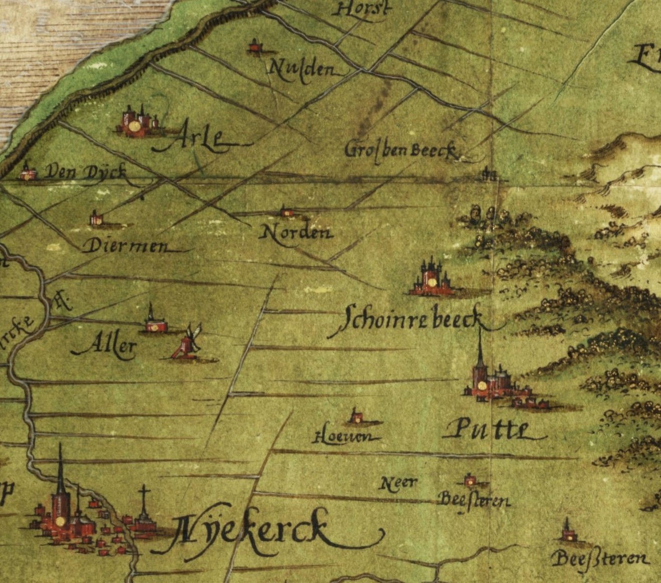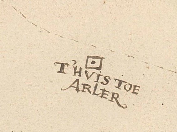 1594 (0203 54-0090) Dezelfde zaak. De broers Henrich en Aalt van Arler komen als klagers in het gericht tegen Reiner van Vaneveld Hendriksen. Hij zou in een contract uit 1574 beloofd hebben om joffer Bije Scholten, weduwe van Reiner van Arler en hun kinderen 1743 gulden te betalen aan momber Gerrit van Arler. Dit vanwege belastinggeld opgebracht door de huislieden van Putten. 1594 (0203 54-0090) Henrick van Arler de oude tegen Jan Woltersen die beweert met zijn vrouw het goed Arler gepacht te hebben en schade te hebben geleden o.a. aan een paard wat hij gekocht had. Henrick beweert dat hij juist schade heeft opgelopen omdat zij hun pacht termijn niet afgemaakt hebben en hij met veel moeite iemand anders moest zien te krijgen. 1598 (0203 585-0313) Schrasser en Naele van Arler bezitten 1 m Eekrijs? (slecht leesbaar). 1603 (0203 585-0356) Henrick van Arler de jonge scholt te Putten en Truide van Ommeren met Gerrit van Arler hun oom als momber maken testament. Zij wonen in het goed en getimmer Bollegoed (Bijstein) in Beisteren. 1607 (0203 587-0044) Verklaring Naele van Arler met Evert Schrasser. Reiner van Arler scholt van Putten is voogd. Zij heeft 1/3 part van 4.5m meenland geërfd van zuster Margarita van Arler, weduwe van Dirck Voet burgemeester te Harderwijk, drie morgen onder Diermen in 3 kampen gezamenlijk met gelijke 3 m van de erven Dirck Voet, 1.5m bij Arler die ze zelf gebruiken. 1609 Een wel heel tastbaar bewijs voor het bestaan van het huis Arler komt voor op een tekening van Kempinck van de polder Arkemheen uit 1609 (fig. 5). Hier staat overduidelijk, met de naam erbij geschreven, het Huis Arler getekend aan de Arlersteeg. Jammer genoeg zijn bijna alleen de randen van de polder gedetailleerd weergegeven.