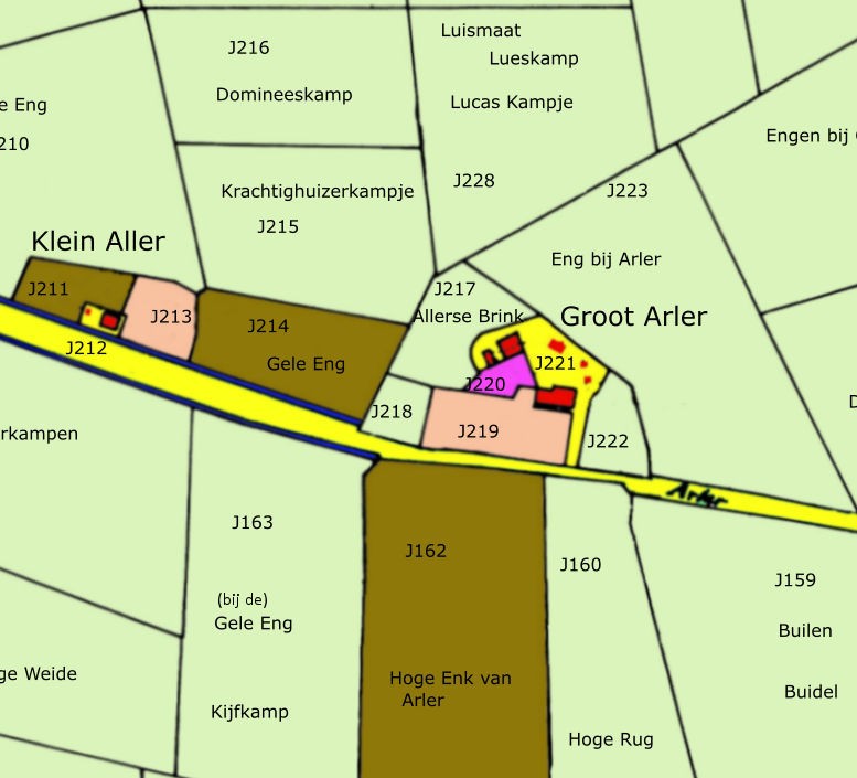 In 1830 (0168-1128-0293) koopt hij ook Klein Arler van Aalt Hartgersen. 1832 (0168-1130-0321) Aflossing hypotheek Harmen van Es. 1832 Harmen van Es eigenaar volgens kadaster J217-222, 160, 161, 162 en 231, Vorige eigenaar was Aalt van de Veen. Weiland J210 aangekocht van Jannetje Hartgersen. 1836 (memsuc 22-0221) Jan Gerritsen van Arler is bouwman op Arler. Een achternaam nu verplicht. Boeren nemen vaak de naam van de boerderij aan, zoals in de volksmond al gebeurde. Hij zal de zoon zijn van de vroegere eigenaar Gerrit Jansen. 1840 (0168-1138-0427) Gijsje Willemsen Nijboer nu weduwe van Harmen van Es. 1871 (memsuc 62-0194) Vanwege overlijden van Gijsje Nijboer, weduwe van Harmen van Es, zijn op Groot Arler aanwezig: Aalt van Es koopman, Willem van Es landbouwer, Harmen van Winkoop met Jannetje van Es, Frederik Willem Schuld met Jannetje van Es. 1871 (0168_3901-0149) Nalatenschap Harmen van Es en Gijsbertje Nijboer, Groot Arler omvat erfpercelen J217, 218, 219, 1042 en 1043 totaal 1.18 ha. Afdracht 1 mud 7 schepel 8 koppen rogge aan Staverden. Daarbij J162, 231 en 1005=ongeveer J210. Willem van Es krijgt Groot Arler met bouwland J162, de Hoge Enk van Arler. 1890 (Pliester 2232) Willem van Es verkoopt aan Aalbert Johanneszoon van Hell de bouwerfjes Groot Arler en Klein Arler J162, 218, 222, 211-215, 1174-1177. 1905 (memsuc 87-0547) Heintje van Meerveld overleden, zij was gehuwd met Harmen van Drie en pachter op Groot Arler. Wat vreemd is, is dat er pacht betaald moet worden aan baron van Goltstein vanwege de hofstede op Arler. Het gaat vrijwel zeker om land bij de hofstede op Arler, namelijk de Hoge Rug (J160 en J161) in bezit van Goltstein. 1916 (Oudendijk Pieterse 2241) Nalatenschap Aalbert van Hell. Aan zoon Dirk van Hell komen de boerenplaatsjes Groot Arler en Klein Arler J162, 218, 222, 211-215, 1174-1177 van 7.20 ha. Dominees kamp J216. Dan nog J231 en de Lucas kampen J228, 230. 1923 (Deibert 1112) Dirk van Hell verkoopt Groot Arler aan Geurt Evers