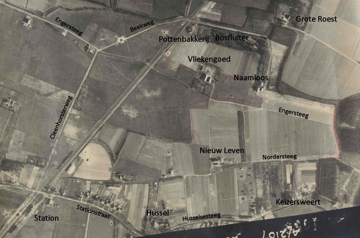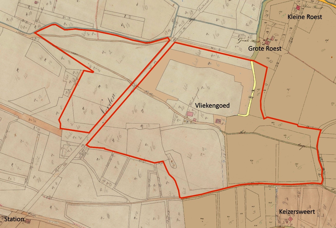 Jammer is dat alle in de verkoopakte genoemde kadastrale percelen samen zijn genomen zodat de afzonderlijke percelen per boerderij niet duidelijk worden. Pas na overlijden van Anna Frederika Everdina in 1917 is er een onderverdeling te zien in haar aangifte voor successierecht. Alleen heb ik dan weer geen kadastrale kaart van die tijd. Door puzzelwerk heb ik op de kadastrale kaart van 1881 een reconstructie kunnen maken hoe groot het gebied van Vliekengoed was rond 1900 (fig. 3). De bewoners in 1837 zijn “Abraham Gerritsen van Norden bouwman wonende op Vliekengoed als in huwelijk hebbende Hendrikje van Spiek” (memsuc 23-0434). Abraham is de zoon van de eerder genoemde Gerrit Gerritse van Norden en Heintje Abrahams. Hun zoon Hendrik van Norden met Jannetje van Nijhuis volgen in 1867 op. Zijn ouders zijn dan naar Amerika vertrokken. Een korte periode van 1901 tot zijn overlijden in 1906 is Jan Aartsen Dokter bewoner, hij was getrouwd geweest met Gerritje Plug. In 1902 worden de gebouwen van Vliekengoed (B166) gesloopt om plaats te maken voor nieuwbouw. In 1906 komt met Jan Ruitenbeek en Hendrika van Malestein een nieuw geslacht op Vliekengoed. Zij worden opgevolgd door hun zoon Wouter Ruitenbeek met Johanna Vliek(!) in 1939. Met hun zoon Johannes Ruitenbeek als laatste bewoner komt er in 1979 een eind aan. Vliekengoed wordt gesloopt om plaats te maken voor het industrieterrein Keizerswoert langs het spoor. Na de het overlijden van Anna Frederika Everdina in 1917 kwam de Vanenburg met de vele boerderijen in de omgeving in handen van neef “Joep” van Pallandt. Hij wist in korte tijd het enorme bezit met feesten en gokpartijen kwijt te raken. Vliekengoed werd in 1925 verkocht aan Jan Ruitenbeek en Hendrika van Malestein (Deibert 1639), het was ongeveer 35 ha groot. Het was nu in eigendom van de boer zelf. De Beekweg liep voor 1929 over het spoor nog niet via de Cleenhorsterweg naar het station, maar liep over de eerder genoemde heide met de naam Wezeler en kwam uit bij de plek van de Vanenburger papiermolen op de huidige Engersteeg. De naam Wezeler kwam al voor in de oprichtingspapieren van de papiermolen. De Engersteeg heette toen nog Broeksteeg. De Broeksteeg was de weg naar het Putterbroek rondom de Vanenburg. De vroegere Engesteeg liep toen nog vanaf het dorp langs Colengoed, onderlangs het gebied van Vliekengoed richting boerderij de Praast aan de Vanenburger Allee en verder tot aan de Oeverstraat. Het eerste stuk vanaf het dorp heette ook wel Koesteeg en verderop de Nordersteeg want hij ging naar Groot Norden (Vliekengoed) en naar het vroegere Eltense Klein Norden (tussen Vliekengoed en het station). Door afsluiting van de vroegere Engesteeg bij de Vanenburg ging die naam over op de Broeksteeg. Al werd het van een Engesteeg (smalle steeg) wel een steeg over de Engen (Engersteeg) omdat men de oude naam niet meer begreep of een beetje bang werd van het woord eng. Vliekengoed lag daarna dus aan de Engersteeg. In de jaren na de oorlog ontstond beetje bij beetje het industrieterrein Keizerswoert, al is die naam hier behoorlijk misplaatst want Keizersweert ligt helemaal aan de Husselsesteeg. Bovendien is het, waarschijnlijk om niet plat te praten, met woert nu een soort van eend geworden. Maar Keizersweert kreeg zijn naam door invloed van de Duitse kloosters van het Keizersweert aan de Rijn bij Dusseldorp. Iets met Vlieken, zoals bijvoorbeeld Vlieken Eng, was een veel treffender naam geweest voor het industrieterrein. Ik kan alleen maar bedenken dat een associatie met vloeken-vleuken een rol heeft gespeeld bij het afwijzen hiervan. Het eerste gedeelte van de Engersteeg naar het industrieterrein kreeg uiteindelijk ook de naam Keizerswoert en werd afgesloten bij het spoor. Die spoorweg overgang was toch al vaak afgesloten als er lange goederentreinen stonden te wachten op het zakspoor als de sneltrein langs kwam. Het laatste gedeelte van de Nordersteeg is nu de Handelsweg geworden.